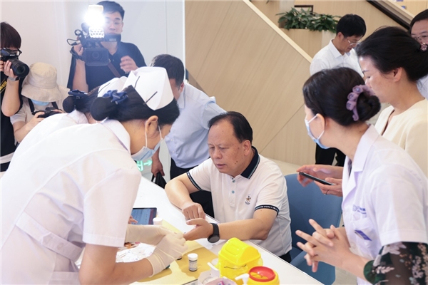湖南省人大常委会副主任、湖南省总工会主席周农在三诺健康糖尿病门诊体验慢病多指标快速检测