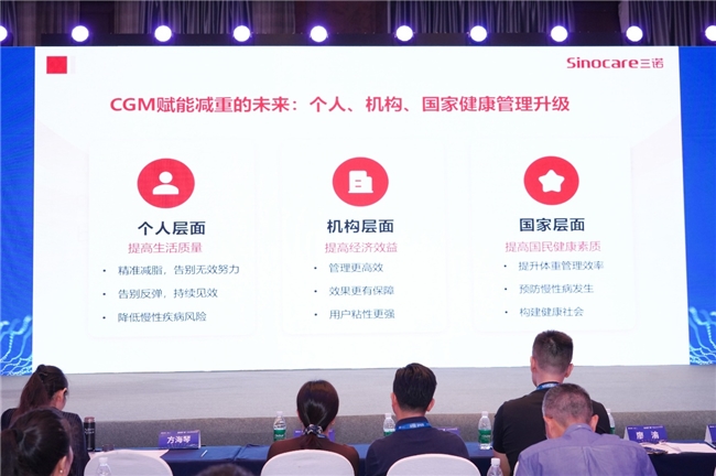 会上,三诺糖尿病逆转中心主任、国际生活方式医学认证医生廖渝教授发表题为《CGM赋能减重,数字化驱动健康管理升级》的主题演讲。她特别展示了三诺生物通过“7天CGM减重服务”在减重和血糖改善方面取得的成效。