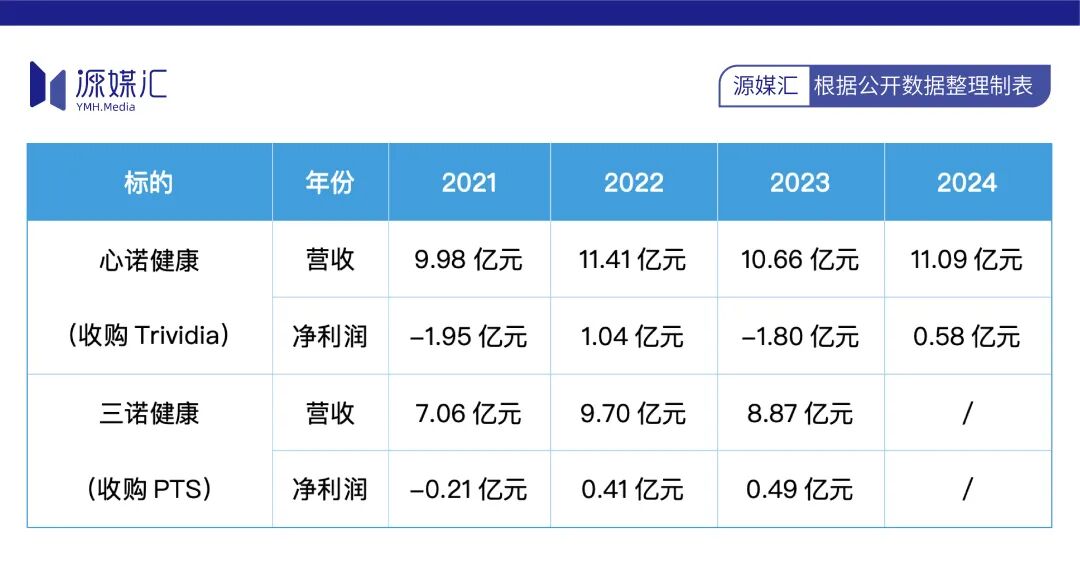 收购Trividia的主体心诺健康,近年来业绩波动剧烈:2021年净亏损1.95亿元;2022年扭亏为盈至1.04亿元;2023年再度亏损1.80亿元;2024年虽实现净利润0.58亿元,但整体仍缺乏持续稳定的盈利能力。而收购PTS的主体三诺健康,2021年亏损0.21亿元;2022、2023年虽小幅盈利0.41亿元、0.49亿元,但增长乏力,未达到收购时的业绩预期。