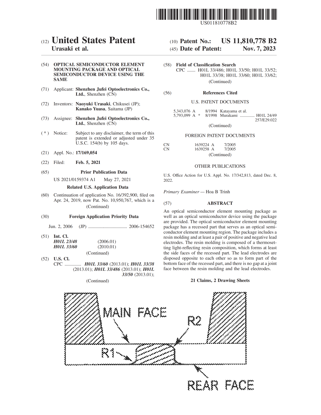 近日,聚飞光电申请的热固性树脂(保括EMC、SMC、UP等热固性材料)封装国际专利US11810778B2获得美国专利商标局授权,授权日为2023年11月7日。此专利保护的封装产品不限于采用切割或落料工艺制造,是热固性树脂封装的高价值核心基础专利。