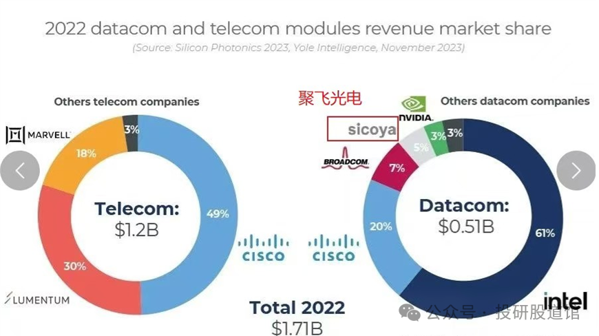 在数据通信领域,英特尔以61%的市场份额处于领先地位,其次是思科占据20%,博通占据7%,sicoya占据5%,英伟达占据3%,而其他小型厂商共同占据剩余的3%市场份额。