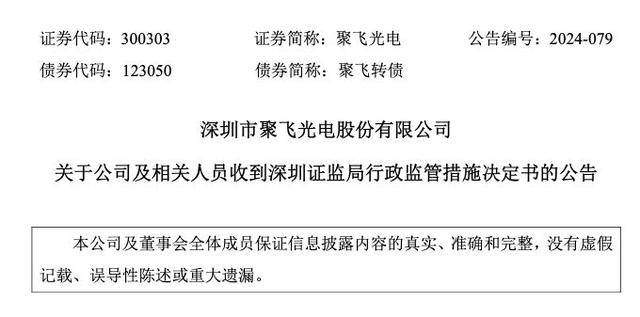 近日,深圳市聚飞光电股份有限公司(简称“聚飞光电”)因多项财务管理和公司治理不规范问题,被中国证券监督管理委员会深圳监管局(深圳证监局)采取责令改正措施,并有多位高管收到警示函。