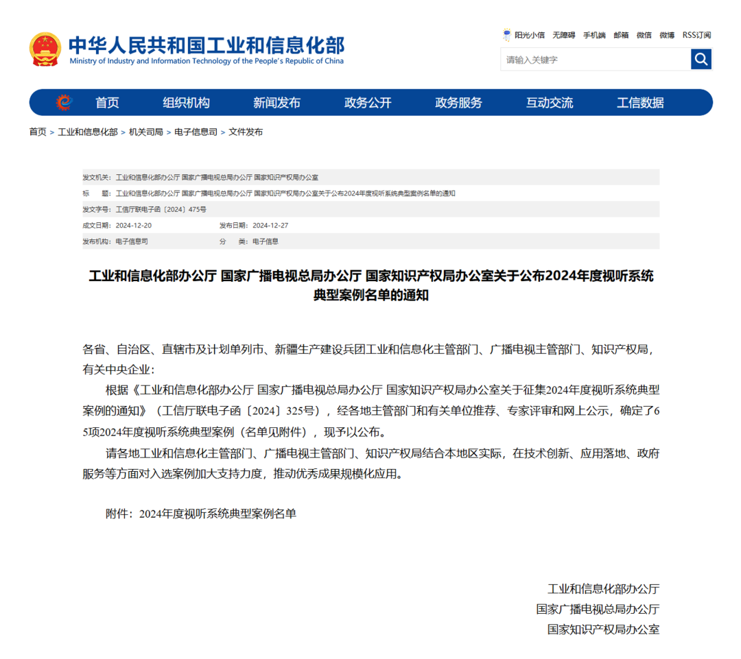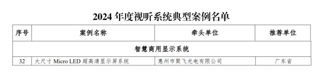 近日,由工业和信息化部、国家广播电视总局、国家知识产权局联合评选的“2024年度视听系统典型案例”公示名单正式发布。聚飞光电自主研发的大尺寸 Micro LED 超高清显示屏系统经专家评审及公示程序,凭借其产品表现力、技术创新力及对视听产业的重要推动作用成功入选。