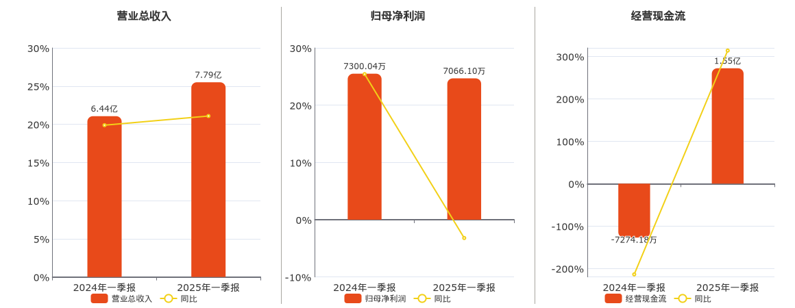 公司营业总收入为7.79亿元。归母净利润为7066.10万元,较去年同报告期归母净利润减少233.94万元,同比较去年同期下降3.20%。经营活动现金净流入为1.55亿元。