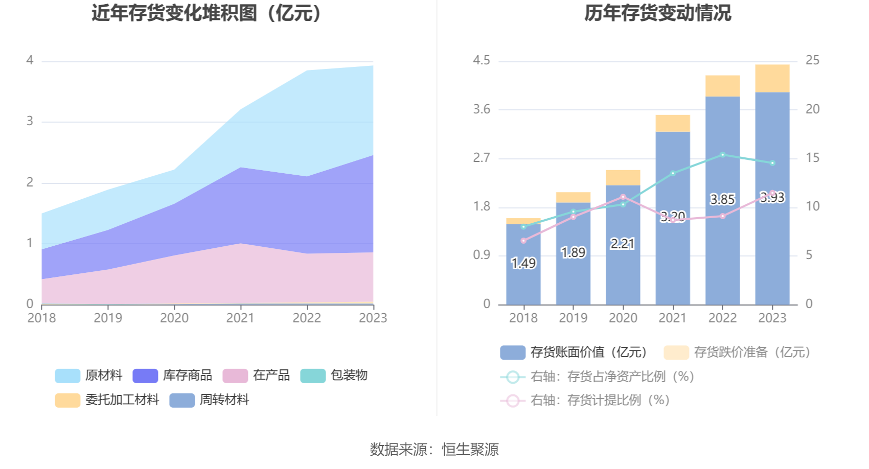 从存货变动来看,截至2023年年末,公司存货账面价值为3.93亿元,占净资产的14.56%,较上年末增加826.94万元。其中,存货跌价准备为5106.18万元,计提比例为11.49%。