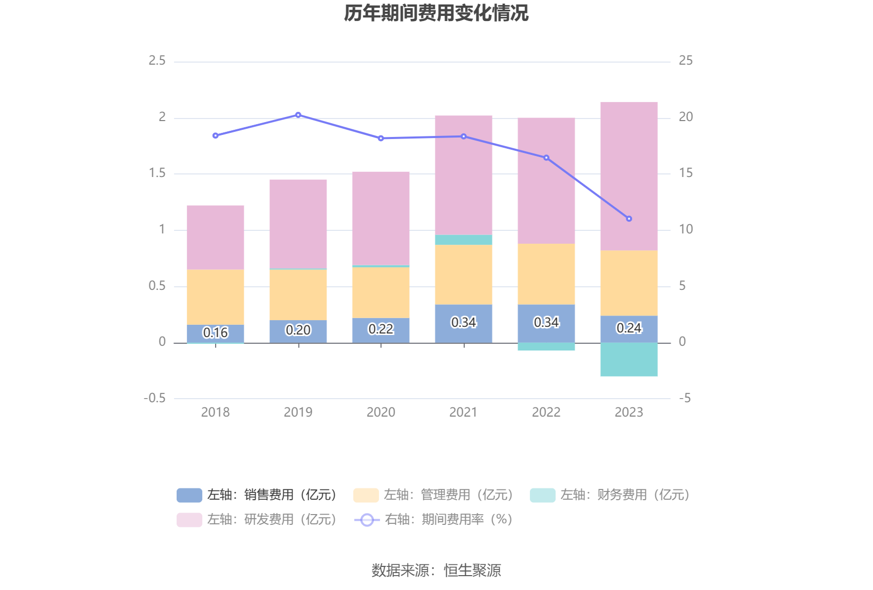 2023年,公司期间费用为1.84亿元,较上年同期减少895.02万元;期间费用率为11.02%,较上年同期下降5.43个百分点。其中,销售费用同比下降30.3%,管理费用同比增长7.22%,研发费用同比增长18.08%,财务费用由去年同期的-728.92万元变为-3004.00万元。