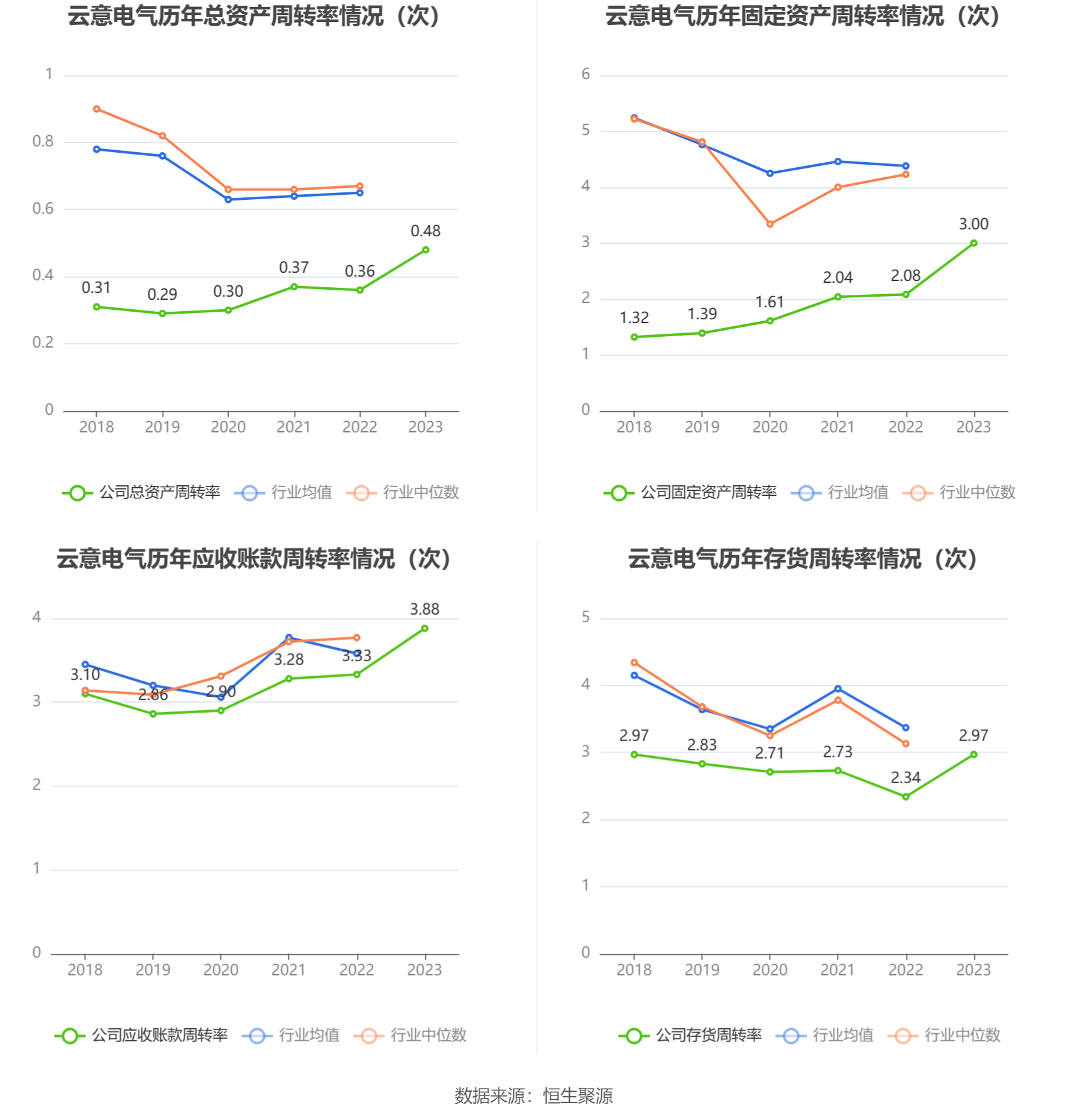 营运能力方面,2023年,公司公司总资产周转率为0.48次,上年同期为0.36次(2022年行业平均值为0.65次,公司位居同行业25/29);固定资产周转率为3.00次,上年同期为2.08次(2022年行业平均值为4.38次,公司位居同行业25/29);公司应收账款周转率、存货周转率分别为3.88次、2.97次。