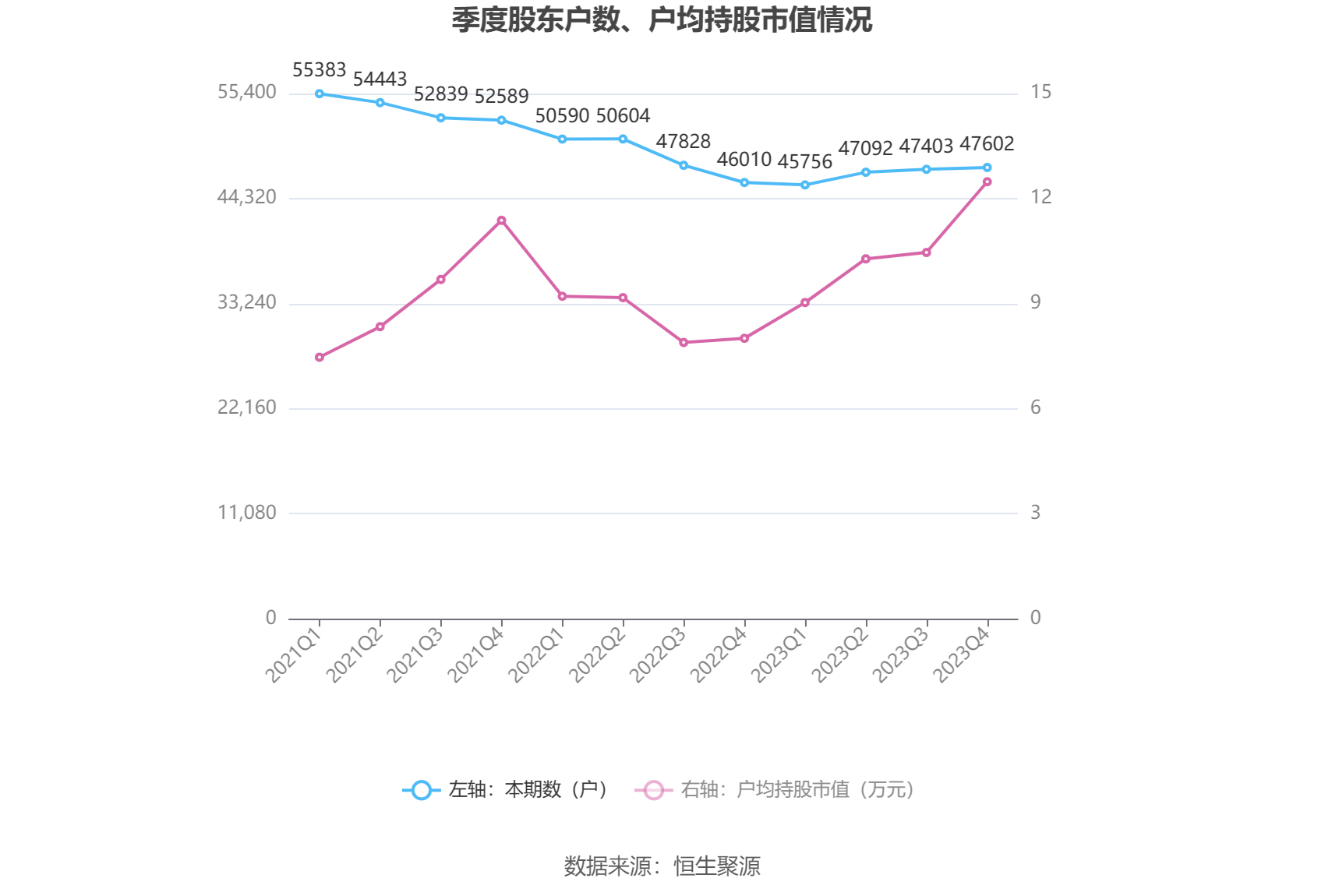 筹码集中度方面,截至2023年年末,公司股东总户数为4.76万户,较三季度末增长了199户,增幅0.42%;户均持股市值由三季度末的10.46万元上升至12.48万元,增幅为19.31%。
