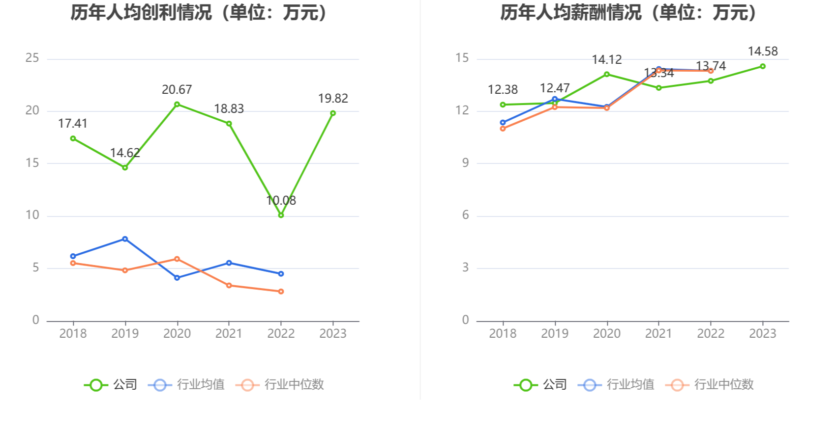 截至2023年末,公司员工总数为1539人,同比增加14%;人均创收108.59万元,人均创利19.82万元,人均薪酬14.58万元,较上年同期分别增长24.82%、96.56%、6.11%。