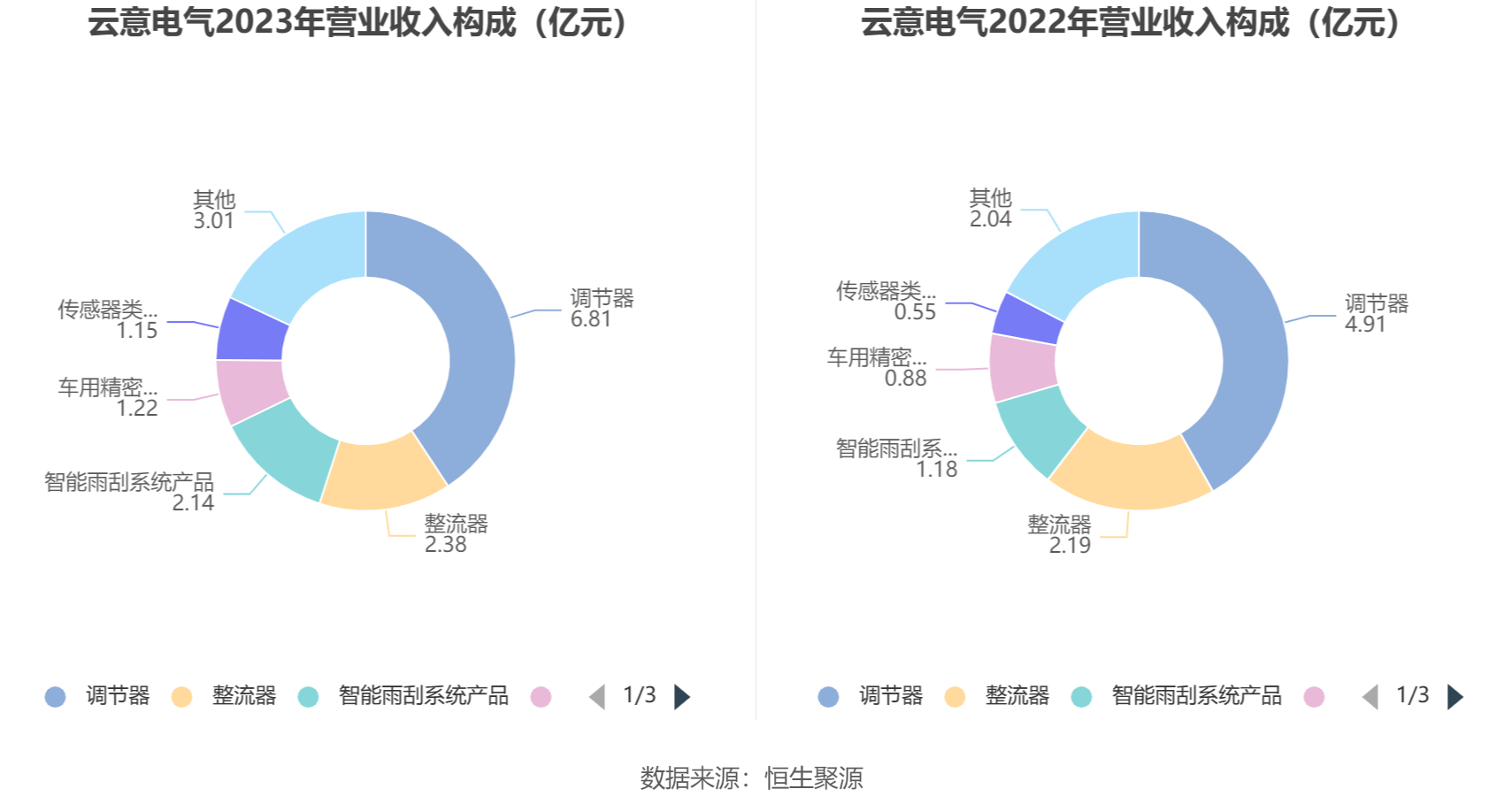 分产品看,调节器、整流器、智能雨刮系统产品2023年毛利率分别为34.64%、31.04%、23.47%。