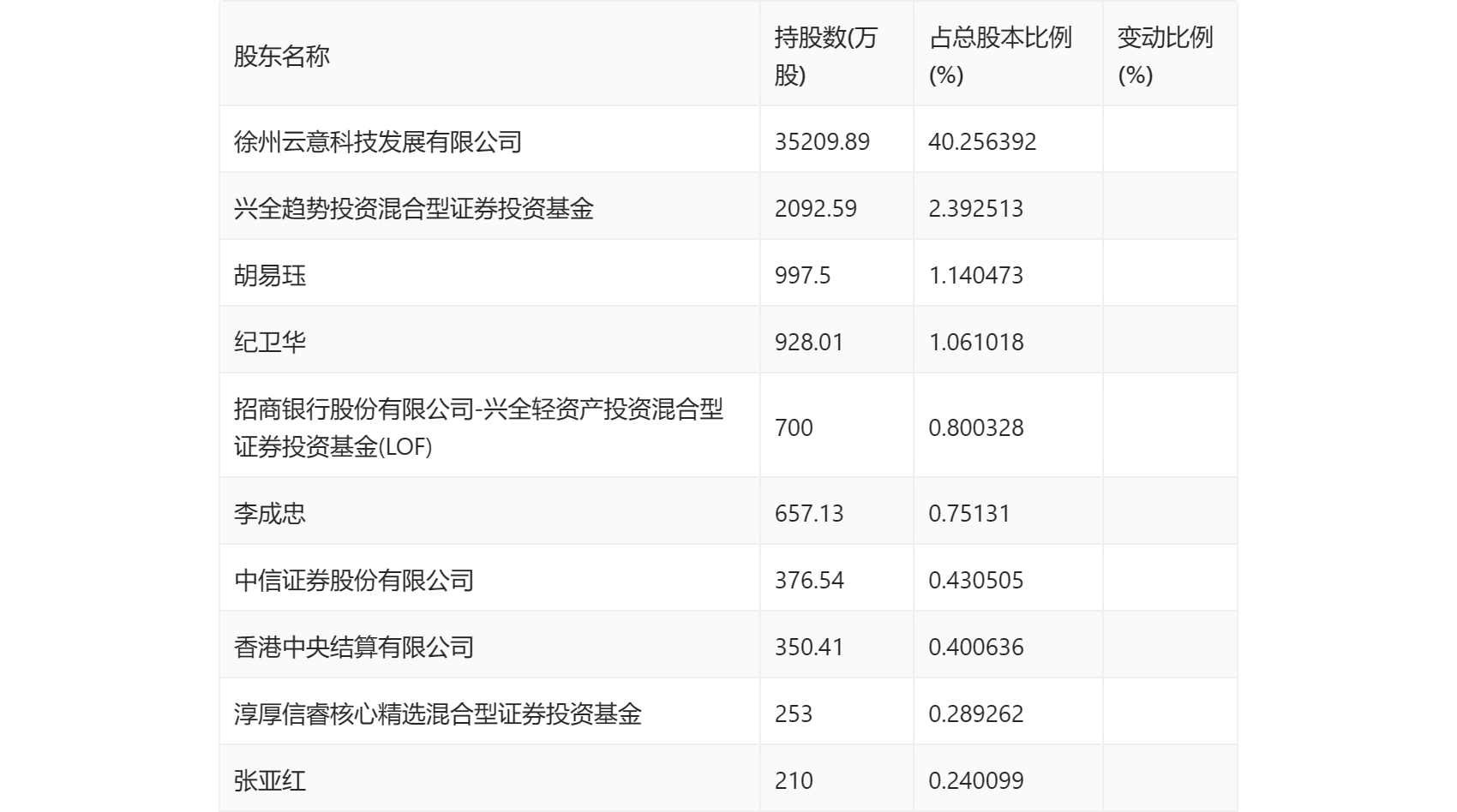 年报显示,2023年年末公司十大流通股东中,新进股东为兴全趋势投资混合型证券投资基金、招商银行股份有限公司-兴全轻资产投资混合型证券投资基金(LOF)、中信证券股份有限公司、香港中央结算有限公司、淳厚信睿核心精选混合型证券投资基金、张亚红,取代了三季度末的徐州德展贸易有限公司、江苏云意电气股份有限公司回购专用证券账户、高盛公司有限责任公司、MERRILL LYNCH INTERNATIONAL、廖茜、MORGAN STANLEY & CO.INTERNATIONAL PLC.。