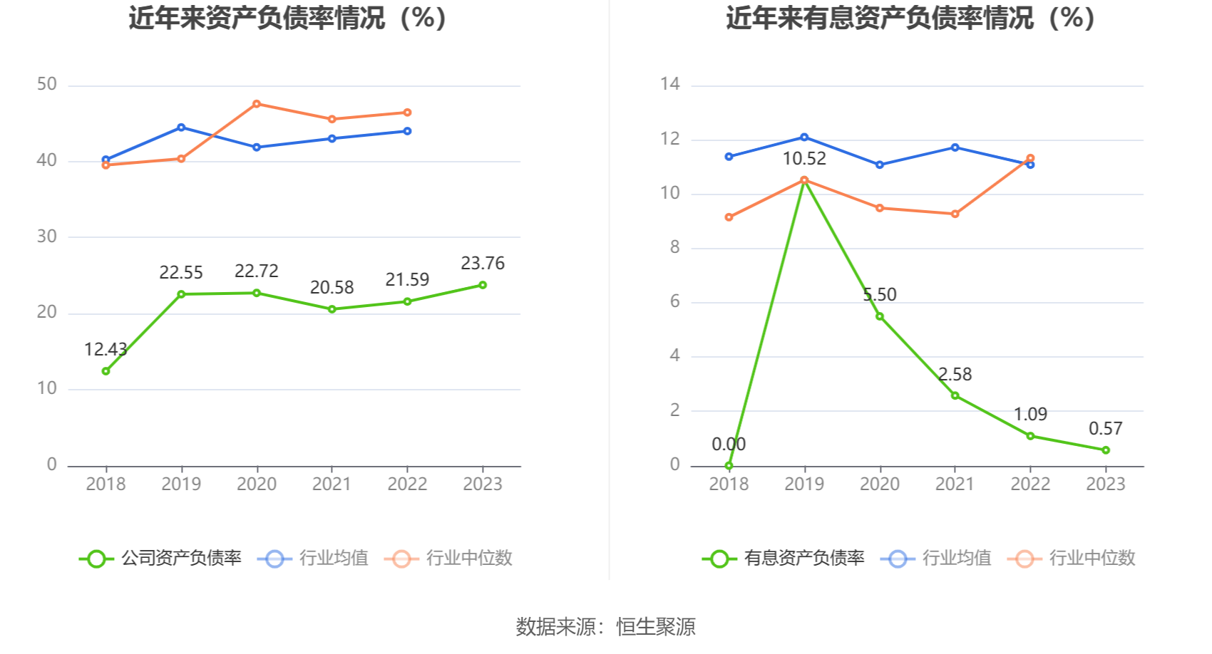 在偿债能力方面,公司2023年年末资产负债率为23.76%,相比上年末上升2.17个百分点;有息资产负债率为0.57%,相比上年末下降0.52个百分点。