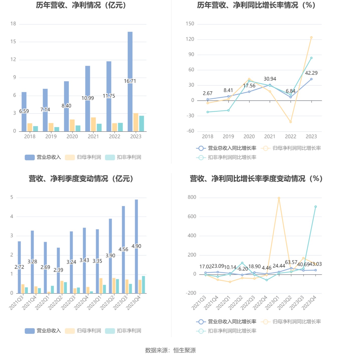云意电气(300304)3月21日披露2023年年报。2023年,公司实现营业总收入16.71亿元,同比增长42.29%;归母净利润3.05亿元,同比增长124.07%;扣非净利润2.61亿元,同比增长83.82%;经营活动产生的现金流量净额为2.12亿元,同比增长127.57%;报告期内,云意电气基本每股收益为0.35元,加权平均净资产收益率为11.64%。公司2023年年度利润分配预案为:拟向全体股东每10股派0.6元(含税)。