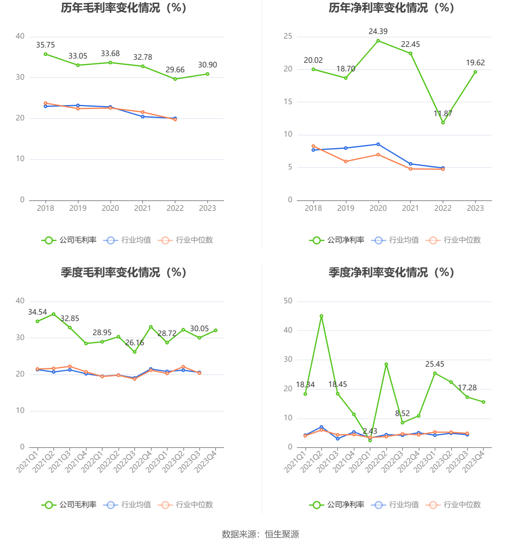 2023年,公司毛利率为30.90%,同比上升1.24个百分点;净利率为19.62%,较上年同期上升7.75个百分点。从单季度指标来看,2023年第四季度公司毛利率为32.09%,同比下降0.96个百分点,环比上升2.04个百分点;净利率为15.60%,较上年同期上升4.74个百分点,较上一季度下降1.68个百分点。