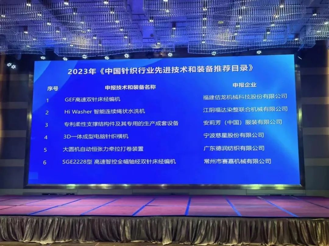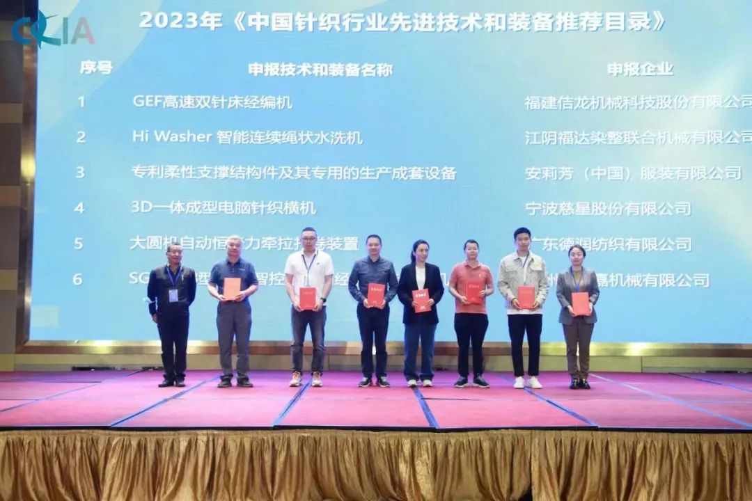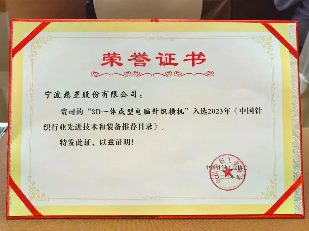 会上,中国针织工业协会副秘书长李红宣读了2023 年《中国针织行业先进技术和装备推荐目录》的决定”,慈星股份“3D一体成型电脑针织横机”等 11 项先进技术和装备入选了2023 年《中国针织行业先进技术和装备推荐目录》,并荣获荣誉证书。