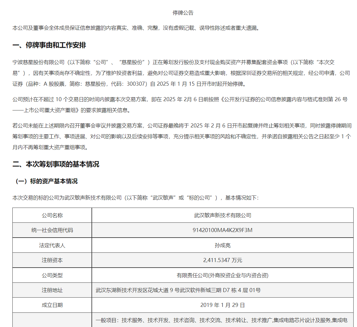 在资本市场风起云涌的当下,慈星股份(300307.SZ)正计划发行A股股票及支付现金购买武汉敏声新技术有限公司(以下简称“武汉敏声”)控股权,并同步募集配套资金。这一跨界并购引起了市场的广泛关注和热议。
