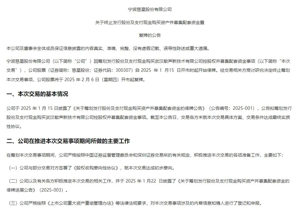2月5日晚,慈星股份公告称,决定终止发行股份及支付现金购买武汉敏声新技术有限公司(以下简称武汉敏声)控股权并募集配套资金事项,公司股票于2月6日开市起复牌。