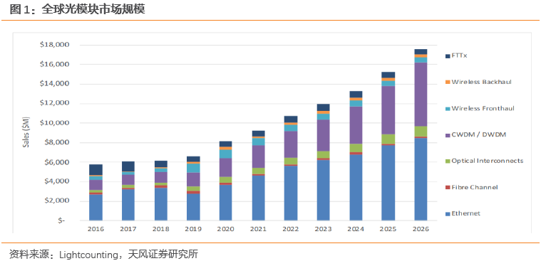 随着人工智能、自动驾驶、VR/AR以及云计算等新技术和应用的持续发展带动算力需求和数据流量的加速增长,以及国内“东数西算”战略的逐步落地,海外以及国内光模块市场有望持续成长。根据Lightcounting预测,光模块市场规模未来5年将保持14%年复合增速,2026年预计达到176亿美元。Yole预测2022年中国光模块市场规模有望达到33亿美元,同比增长22%。