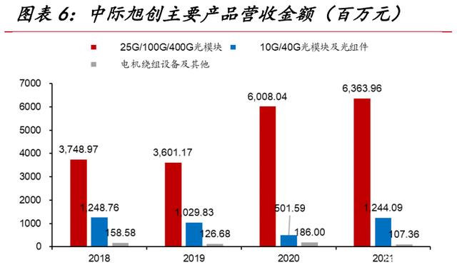 中际旭创的主要营收来源为高端光模块产品。自 2018 年,公司光模块业务营收占比保持在 95%以上。2021年全年中际旭创的总营业收入达到 76.95 亿元,同比增长 9.16%。其中高速光通信模块业务收入达 63.64 亿元,占比 82.70%;中低速光通信模块和光组件业务收入达 12.25 亿,占比 15.91%。另一主营业务为电机绕组设备,实现营收 1.07 亿,占比约为 1.40%。