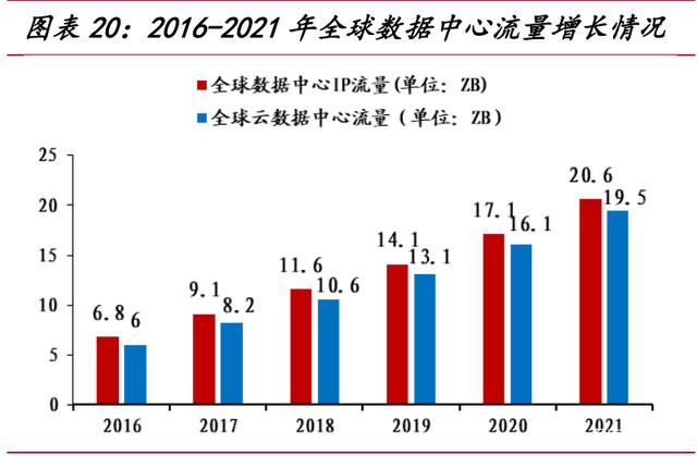 根据思科的数据统计,截至 2021 年,全球云数据中心流量将由 2016 年的 6.0EB 增长至 19.5EB,较 2020 年增长了 21.1%。并且随着数字经济的发展,云计算渗透率将大幅提升。Gartner 的数据显示,2021 年云计算的市场渗透率达到 15.3%。这使得 IDC 及光模块的行业景气度持续提升,其中的光模块产品也在加速更新迭代。