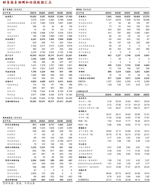 云计算和大数据等技术的应用推动全球超大规模数据中心的加速建设以及AI算力的提升,将持续带动光模块技术的迭代更新及规模化需求。公司作为全球领先的光模块主力供应商,具备技术创新领先优势、快速量产交付能力、完善质量保证体系等优势,经营质量不断改善。公司800G产品需求和订单持续增加,正在开发1.6T光模块,2025年AI客户对1.6T产品需求有望释放。我们预计公司2023-2025年归母净利润为16.13亿元、32.38亿元、42.32亿元,对应PE为48X、24X、18X,首次覆盖给予“买入”评级。