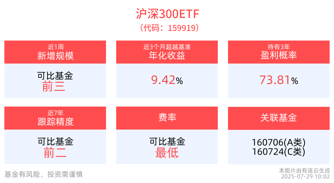 流动性方面,沪深300ETF盘中成交3.18亿元。拉长时间看,截至7月28日,沪深300ETF近1年日均成交11.22亿元。规模方面,沪深300ETF近1周规模增长8.39亿元,实现显著增长。
