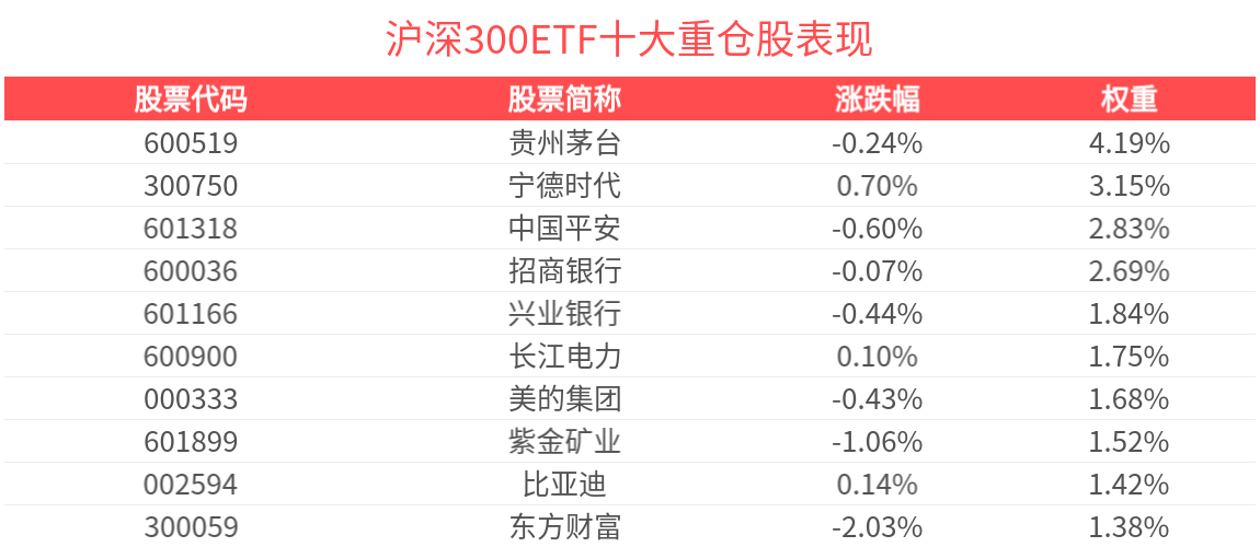数据显示,截至2025年6月30日,沪深300指数前十大权重股分别为贵州茅台、宁德时代、中国平安、招商银行、兴业银行、长江电力、美的集团、紫金矿业、比亚迪、东方财富,前十大权重股合计占比22.76%。