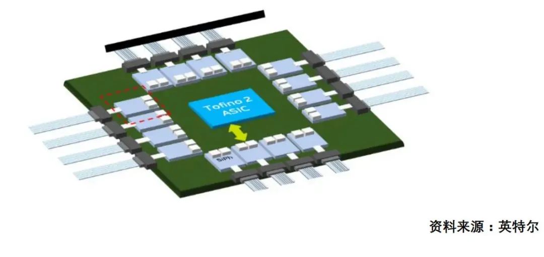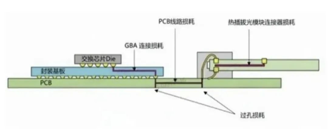 传统方案中交换机的芯片叫ASIC芯片,和光模块分离,是通过PCB导电连接传输信号。