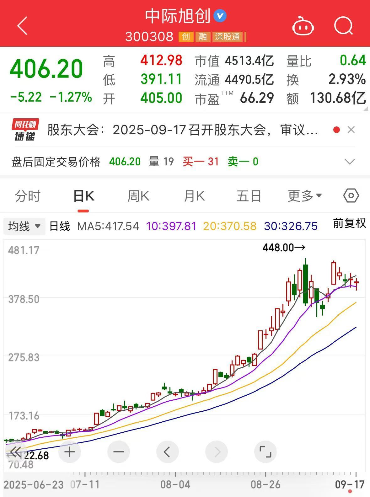 值得一提的是,中际旭创股价自4月18日以来累计涨幅已达421.64%。截至A股今日收盘,中际旭创股价报406.2元/股。市值4513.4亿元。