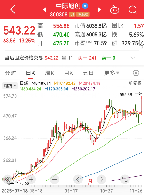 11月26日,A股光模块龙头 中际旭创 大幅上涨,该股盘中一度涨超16%,收盘涨幅回落至13.25%,最新收盘价创历史新高。证券时报·数据宝统计,截至目前, 中际旭创 A股市值飙升至6035.82亿元,排名上升至A股第13位。