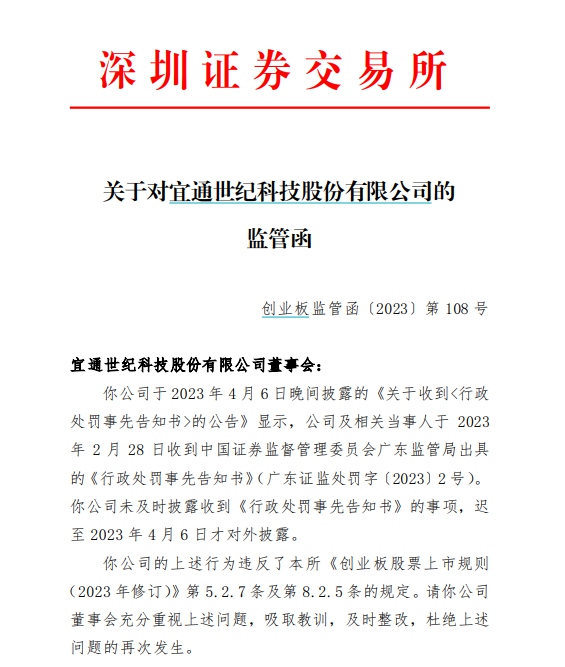 监管函显示,2023年4月6日宜通世纪晚间披露的《关于收到<行政处罚事先告知书>的公告》显示,公司及相关当事人于2023年2月28日收到中国证券监督管理委员会广东监管局出具的《行政处罚事先告知书》(广东证监处罚字〔2023〕2号)。公司未及时披露收到《行政处罚事先告知书》的事项,迟至2023年4月6日才对外披露。