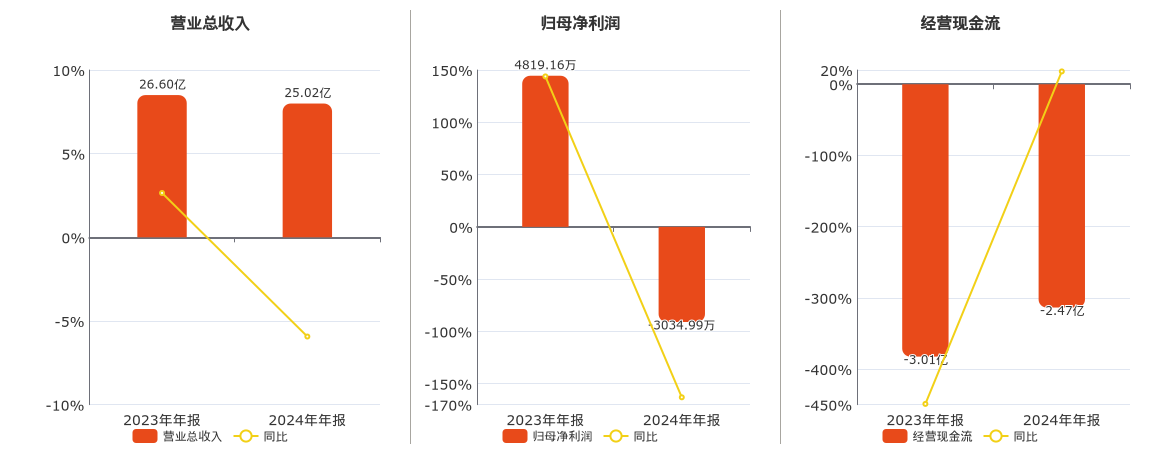 公司营业总收入为25.02亿元,较去年同报告期营业总收入减少1.58亿元,同比较去年同期下降5.93%。归母净利润为-3034.99万元,较去年同报告期归母净利润减少7854.16万元,同比较去年同期下降162.98%。经营活动现金净流入为-2.47亿元。