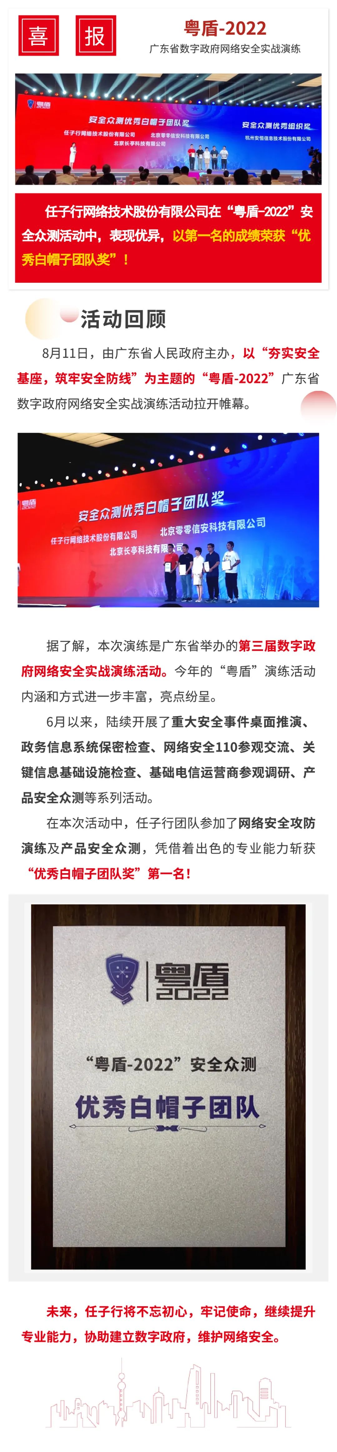 任子行荣获“粤盾-2022” 优秀白帽子团队奖第一名