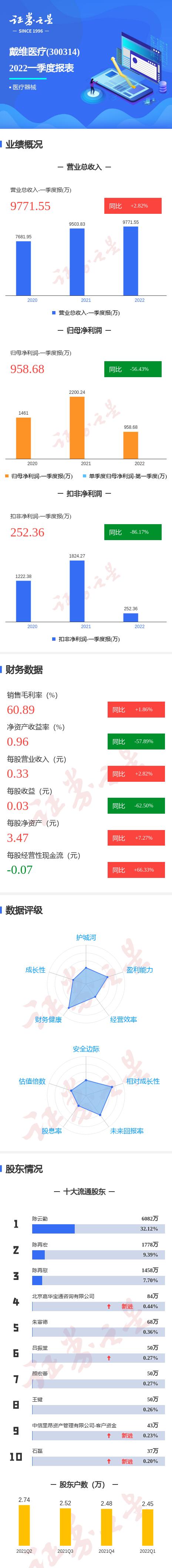 戴维医疗2022一季报显示,公司主营收入9771.55万元,同比上升2.82%;归母净利润958.68万元,同比下降56.43%;扣非净利润252.36万元,同比下降86.17%;其中2022年第一季度,公司单季度主营收入9771.55万元,同比上升2.82%;单季度归母净利润958.68万元,同比下降56.43%;单季度扣非净利润252.36万元,同比下降86.17%;负债率12.45%,投资收益-1251.92万元,财务费用13.99万元,毛利率60.89%。