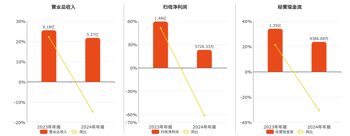 公司营业总收入为5.27亿元,较去年同报告期营业总收入减少9127.22万元,同比较去年同期下降14.76%。归母净利润为5726.33万元,较去年同报告期归母净利润减少9034.76万元,同比较去年同期下降61.21%。经营活动现金净流入为9386.68万元,较去年同报告期经营活动现金净流入减少4133.16万元,同比较去年同期下降30.57%。