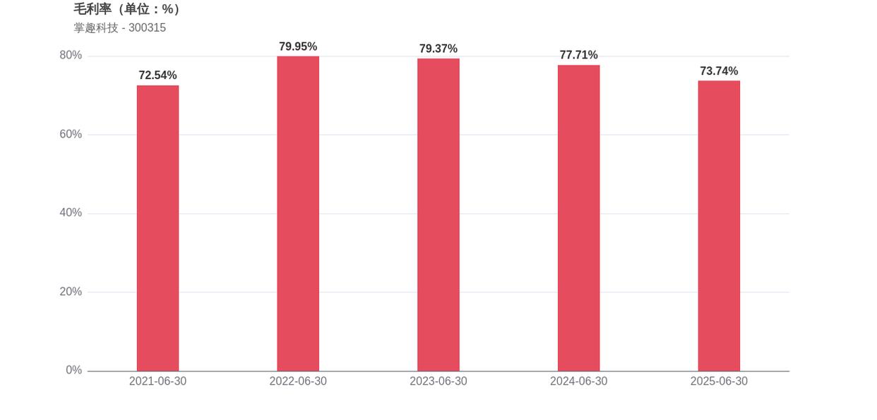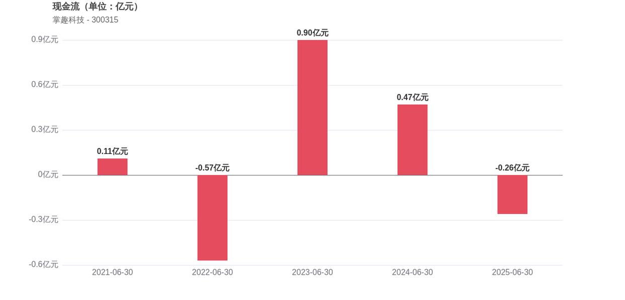 在经营稳健性方面,掌趣科技面临现金流恶化的挑战,经营活动产生的现金流净额由正转负。经营活动产生的现金流净额为-0.26亿元,相比2024年同期的0.47亿元出现大幅转负,显示出公司经营活动现金回流能力减弱。此外,2025年上半年的资产负债率为7.73%,同比下降0.69个百分点,这意味着公司负债水平相对较低。