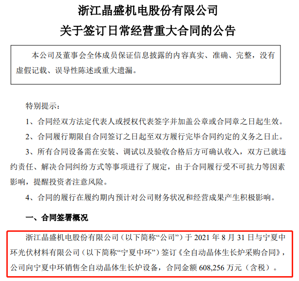 8月31日,单晶炉龙头晶盛机电发布公告称,公司与与宁夏中环光伏材料有限公司(以下简称“宁夏中环”)签订《全自动晶体生长炉采购合同》,合同金额高达 60.8亿元(含税)。