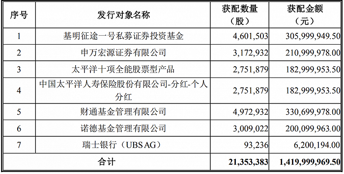 晶盛机电7月19日发布公司向特定对象发行股票发行情况,公司本次发行股票数量为21,353,383股,发行价格为66.5元/股,募集资金总额为1,419,999,969.5元,扣除发行费用(不含税)3,972,974.88元,募集资金净额为1,416,026,994.62元,其中计入股本21,353,383.00元,计入资本公积1,394,673,611.62元。本次向特定对象发行募集资金在扣除发行费用后拟全部用于以下项目:12英寸集成电路大硅片设备测试实验线项目、年产80台套半导体材料抛光及减薄设备生产制造项目、补充流动资金,拟投入募资金额分别为56370万元、43210万元、42420万元。