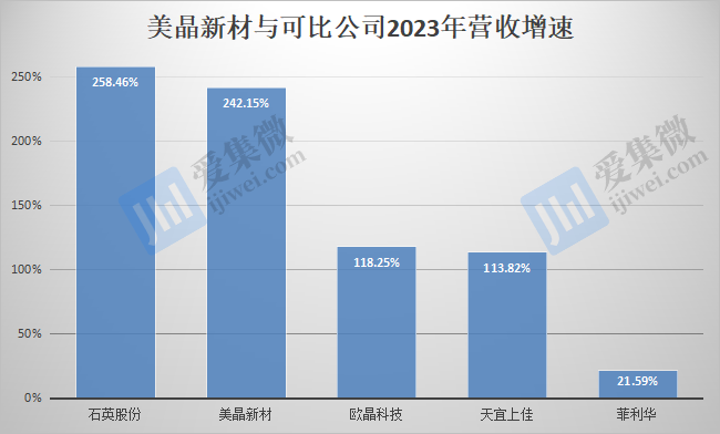 招股书数据显示,美晶新材2023年实现营收36.71亿元,在可比同行中仅次于石英股份,同比增长242.15%,增速也仅次于石英股份的258.46%;如果从2020年的4356.2万元营收开始计算,至2023年末,美晶新材的年复合增速高达338.42%,在可比公司中位居第一。