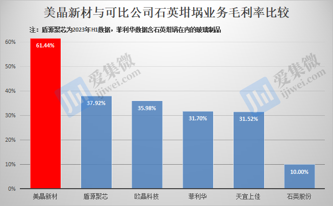 从整体毛利率表现看,2023年,美晶新材仅次于石英股份的87.5%,而大幅领先于其他可比公司,但从石英坩埚这一品类看,美晶新材的毛利率在可比公司中位居第一,且大幅领先于其他可比公司。
