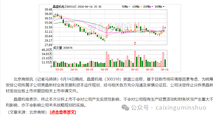 2024年6月14日,晶盛机电(股票代码:SZ:300316)发布公告,宣布公司决定终止分拆子公司浙江美晶新材料股份有限公司(以下简称“美晶新材”)至深圳证券交易所创业板上市的计划,并撤回相关上市申请文件。