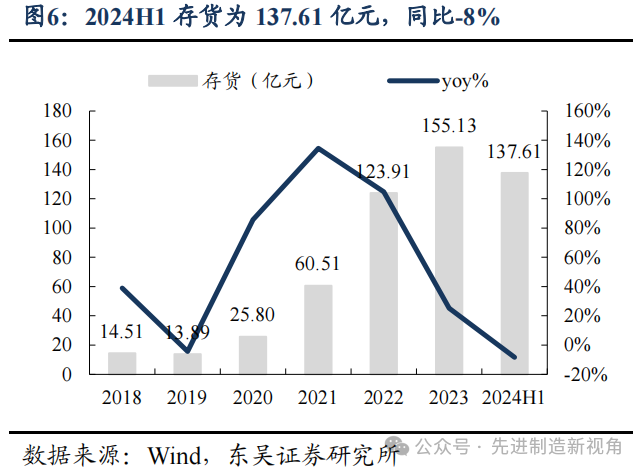 截至2024Q2末公司合同负债为83.67亿元,同比-19%,存货为137.61亿元,同比-8%。2024H1经营活动净现金流为2.87亿元,同比-71.83%,表明订单回款有一定压力。