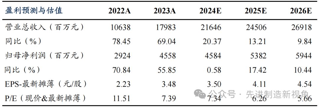 光伏设备是晶盛机电成长的第一曲线,第二曲线是光伏耗材和半导体耗材的放量,第三曲线是碳化硅设备+材料和半导体设备的放量。我们预计公司2024-2026年归母净利润为46(原值56,下调18%)/54(原值65,下调17%)/59(原值73,下调19%)亿元,对应PE为7/6/6倍,维持“买入”评级。