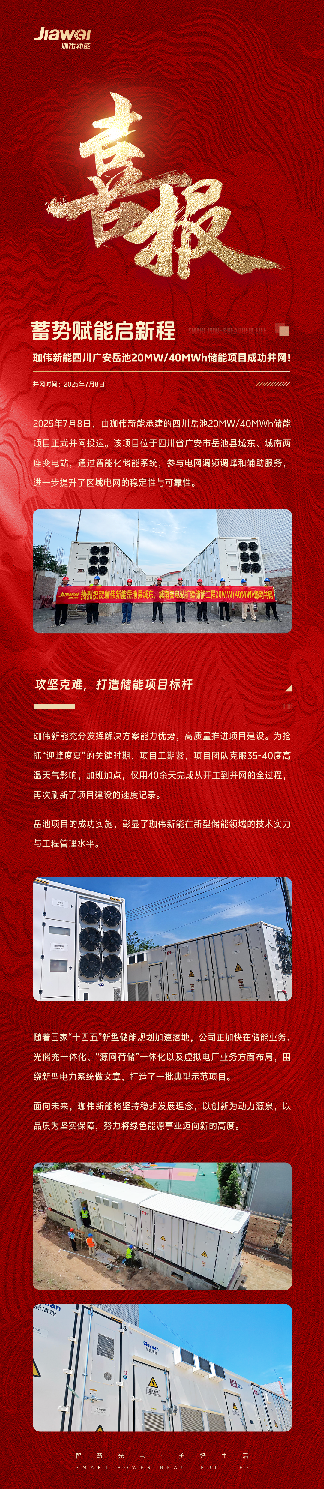蓄势赋能启新程|珈伟新能四川广安岳池20MW/40MWh储能项目成功并网!