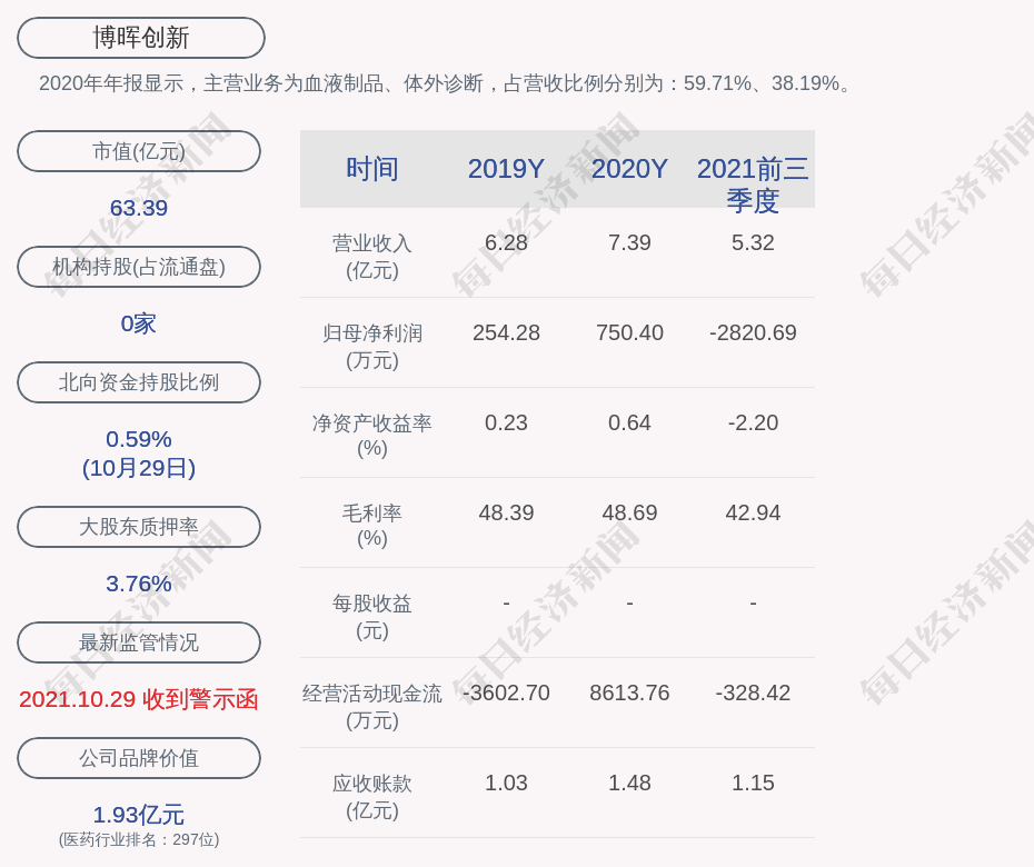 2020年年报显示,博晖创新的主营业务为血液制品、体外诊断,占营收比例分别为:59.71%、38.19%。