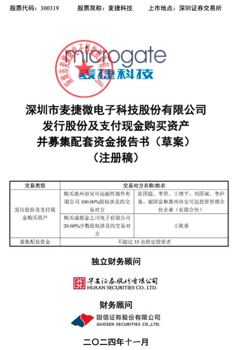 11月27日,深圳市麦捷微电子科技股份有限公司(以下简称“麦捷科技”)发布了并购重组报告书(草案,注册稿),计划通过发行股份及支付现金的方式,收购惠州市安可远磁性器件有限公司(以下简称“安可远”)100%股权和成都金之川电子有限公司(以下简称“金之川”)20%的少数股权,并募集配套资金不超过1.01亿元,用于支付交易现金对价、中介机构费用,以及补充安可远流动资金和偿还债务。
