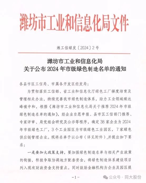 近日,潍坊市工业和信息化局公布“2024年市级绿色制作名单”,同大股份被评为“2024年市级绿色工厂”,这是对同大股份绿色环保产品的肯定。