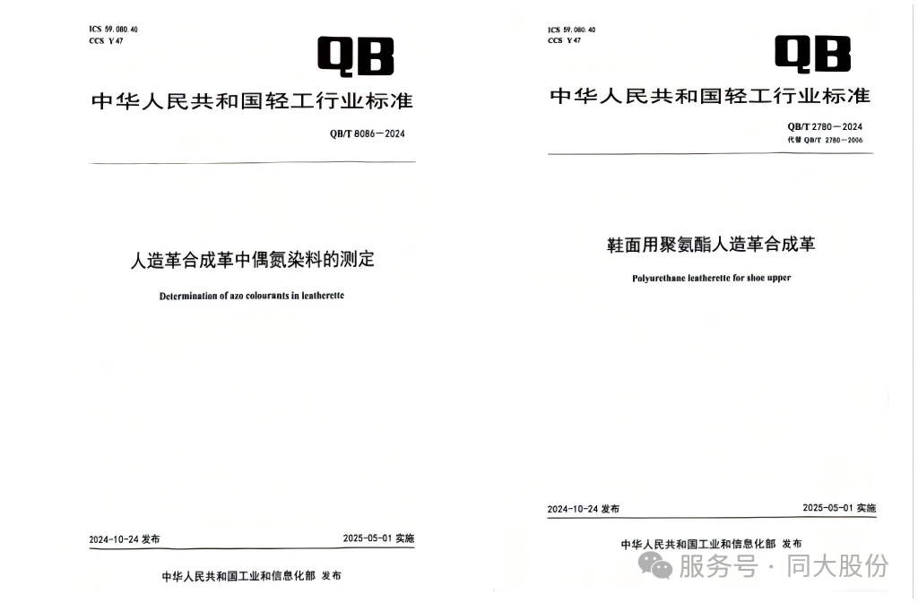 近期,由同大股份参与的《人造革合成革中偶氮染料的测定》(QB/T8086-2024)及《鞋面用聚氨酯人造革合成革》(QB/T 2780-2024)两项行业标准获批发布,并已于2025年5月1日起正式实施。