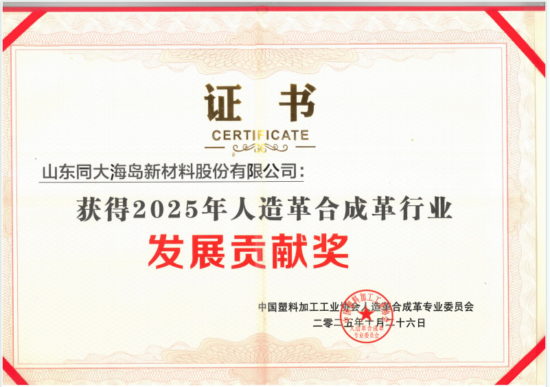 近日, 同大股份 凭借在人造革合成革领域的卓越表现,荣膺由 中国塑料加工工业协会 人造革合成革专业委员会颁发的2025年度人造革合成革行业发展贡献奖。这一权威奖项,是对 同大股份 2025年在技术突破、产业升级与行业赋能等方面突出贡献的高度认可。