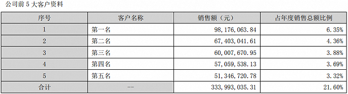 界面新闻查询硕贝德财报,财报并未明确披露双方的合作规模。2022年年报中前五大客户营收占比为21.60%,第一大客户销售占比也只有6.35%,销售额不超过1亿元。
